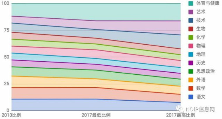 相比于 2003 版课标,此次公布的“新课标”中,对于体育与健康、物理两学科的关注度显著上升;在艺术(音乐和美术)、技术(信息技术和通用技术)上给予了学生更大的发展选择空间,对于在艺术、技术上有兴趣的学生,可以在这两个学科方向上学习更多的“可选择必修课程”。